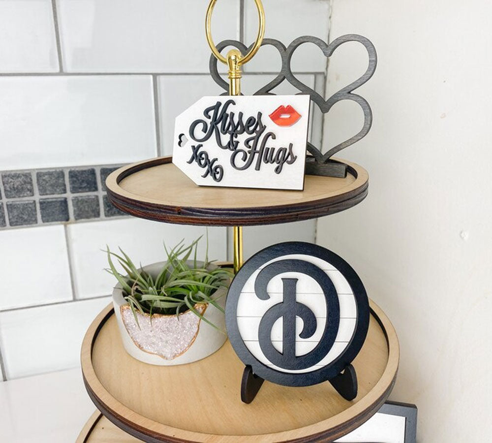 The elements are:-(1) four heart sign cut from sustainably sourced 1/4” Birch Plywood and stained carbon grey. The sign comes with stands so it is free-standing it is 4” x 3”-(1) Infinity sign is 1/2” thick cut from layers of 1/4” Birch Plywood with 1/8” mirrored red acrylic on the front, it is left natural and sealed with shellac and is free-standing. It is 3” x 2”-(1) Kisses & Hugs gift tag is 3”x2” and made from 1/8” MDF and must be propped or leaned against an object.